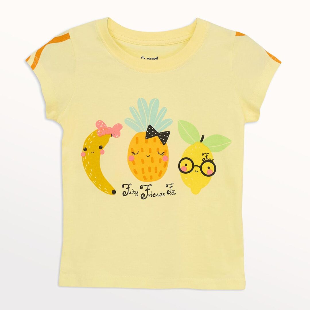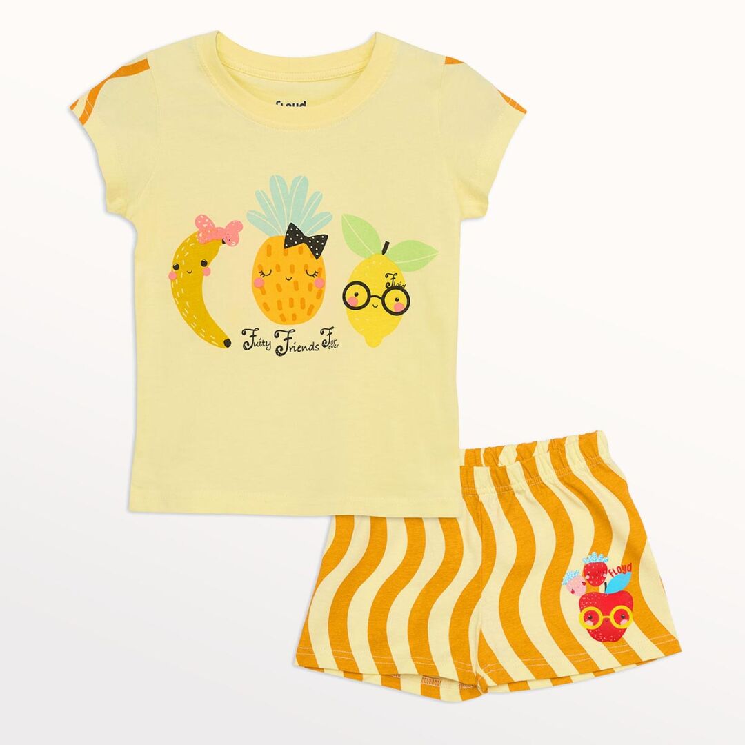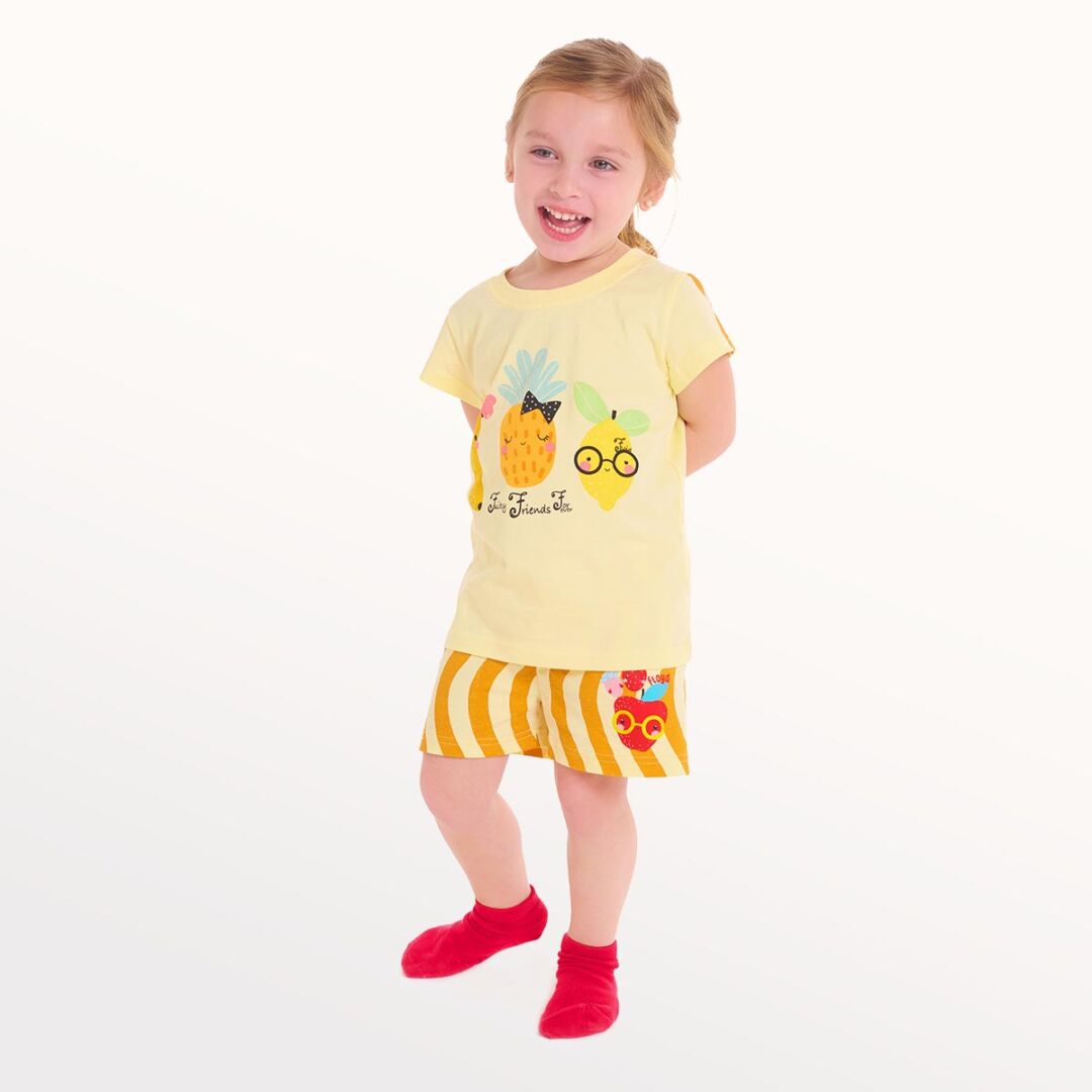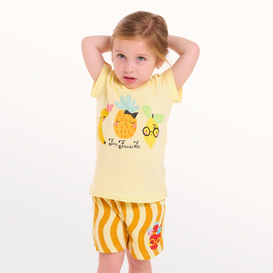 🍍🍋✨ Frutitas amigas que contagian diversión y ternura, con un look perfecto para días de juego y noches de vacaciones. Estampa “Friends Forever” y short con ondas para un verano lleno de sonrisas.